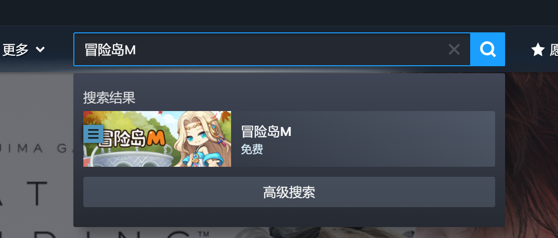 ❌ 错误操作:只搜中文名“冒险岛M”,部分外区商店不识别,导致无搜索结果。